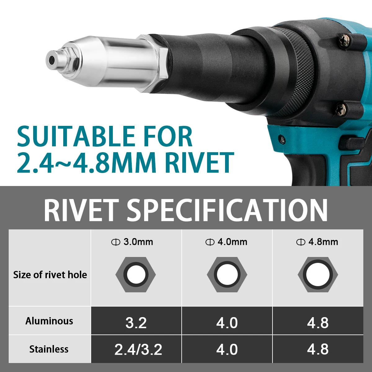 Pistola de rebite elétrica sem escovas GISAM, 20000N, pistola de rebite e porca sem fio de 720W, 2,4–4,8 mm, ferramenta elétrica com inserção de furadeira compatível com bateria Makita de 18 V, possui um motor sem escovas que fornece uma força de tração de 20000N com torque máximo de 588 Nm. Opera a uma velocidade sem carga de 0–1600 r/min, alimentada por uma bateria de lítio de 198VF 7500mAh. Os tamanhos de rebite compatíveis variam de 2,4 mm a 4,8 mm, tornando-a versátil para montagem automotiva e de construção. O motor sem escovas aumenta a eficiência em 50%, previne faíscas e reduz o desgaste. A operação automática inteligente com um botão fixa os rebites em 2–5 segundos, enquanto o baixo ruído garante um ambiente de trabalho confortável. Esta pistola de rebite sem fio se encaixa perfeitamente em espaços apertados e suporta o uso sem esforço com uma mão. As opções de pacotes incluem apenas uma arma, uma bateria ou conjuntos de baterias duplas com carregador, chave inglesa e embalagem em caixa de papelão ou plástico para armazenamento prático.
